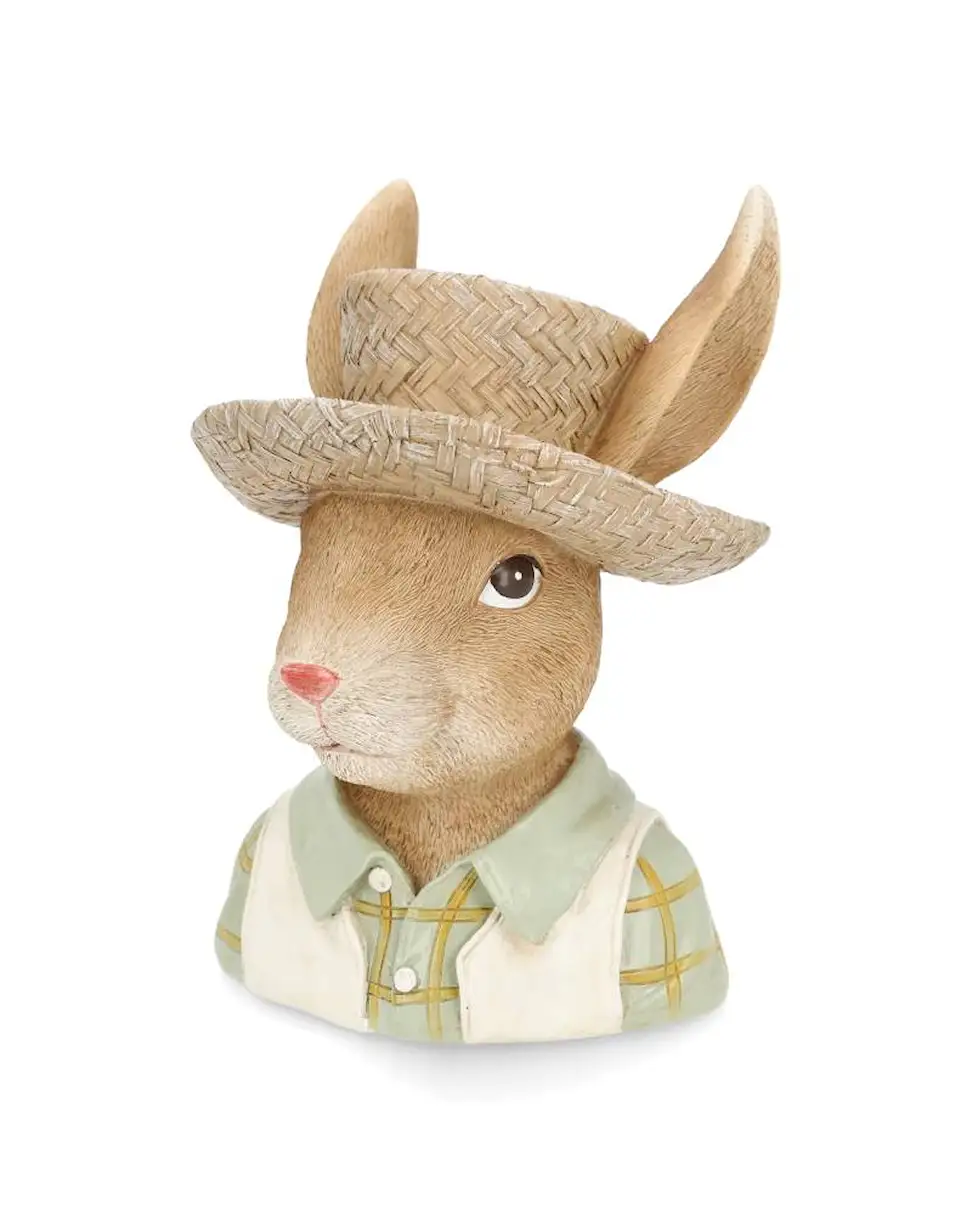 Bust of a rabbit with a shirt and hat. A fun decoration for your home. Perfect for easter. Made from poly.