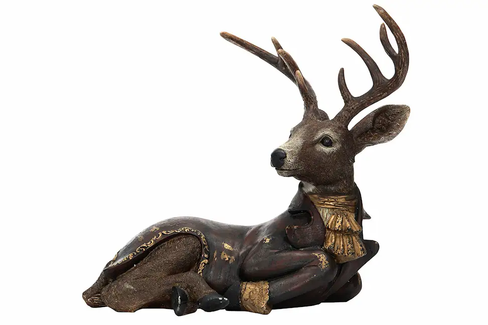 A resting deer dressed sharply will be a playful addition to your home. Made from poly.