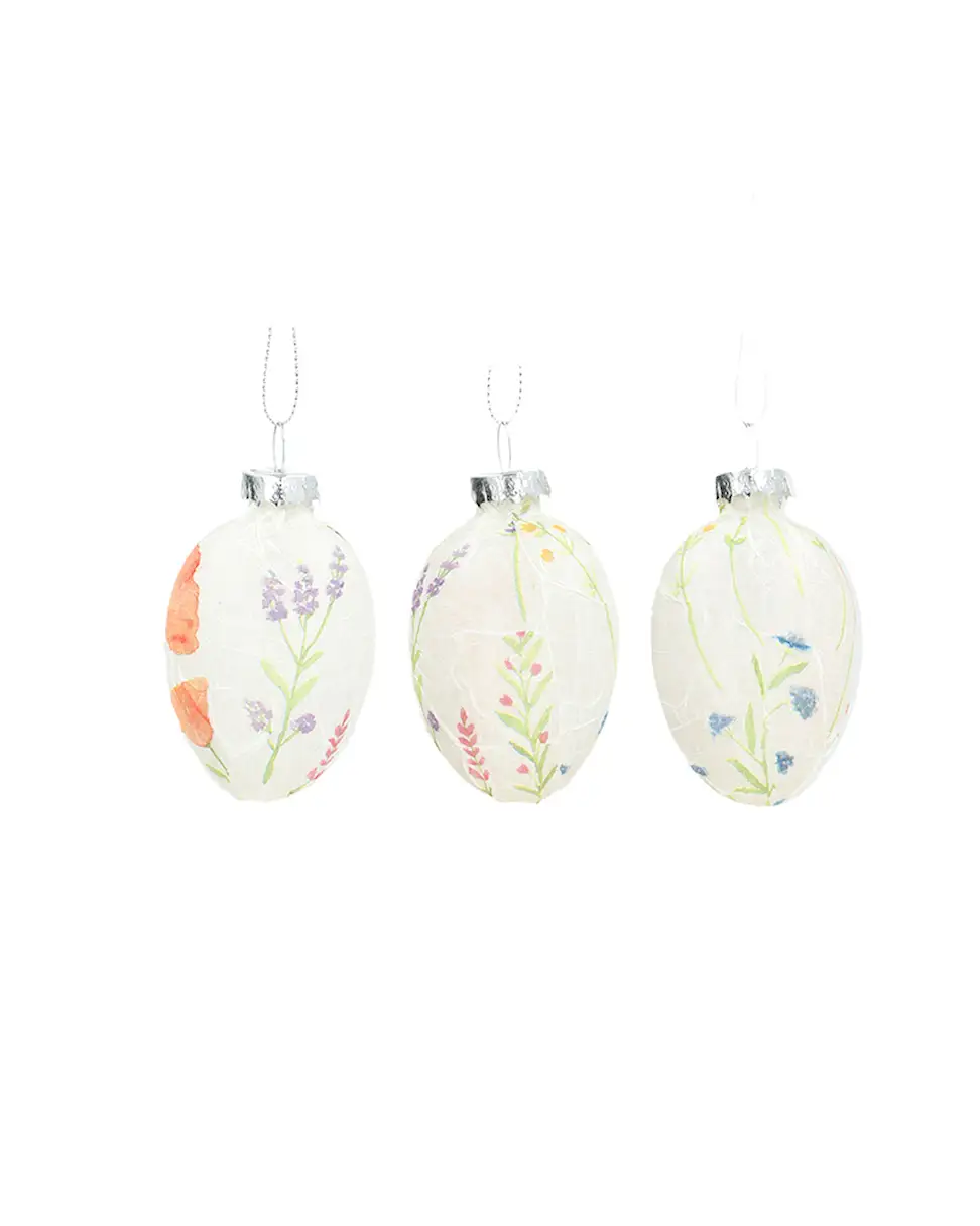 Decorate an arrangement of twigs or an easter bouquet with this floral hanging egg. Made from glass.