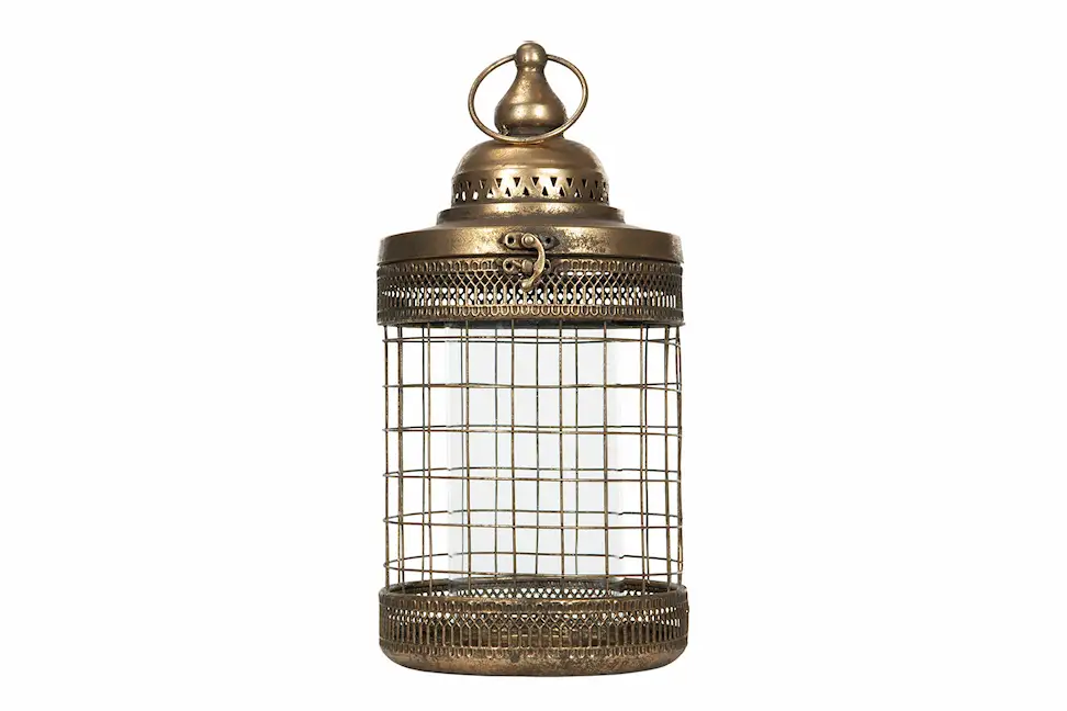 Metal lantern with a beautiful mesh pattern and an opening at the top. Glass cylinder where the candle stands. Made of metal.