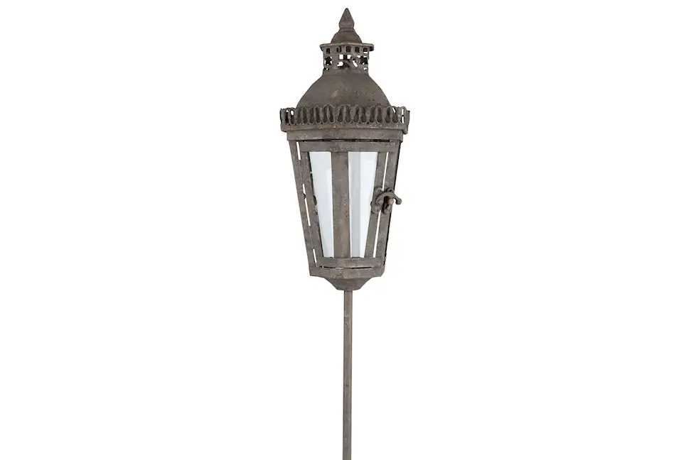 Beautiful lantern on a stick with ornate details. When you want vintage feel for your garden lights. Made from metal and glass.