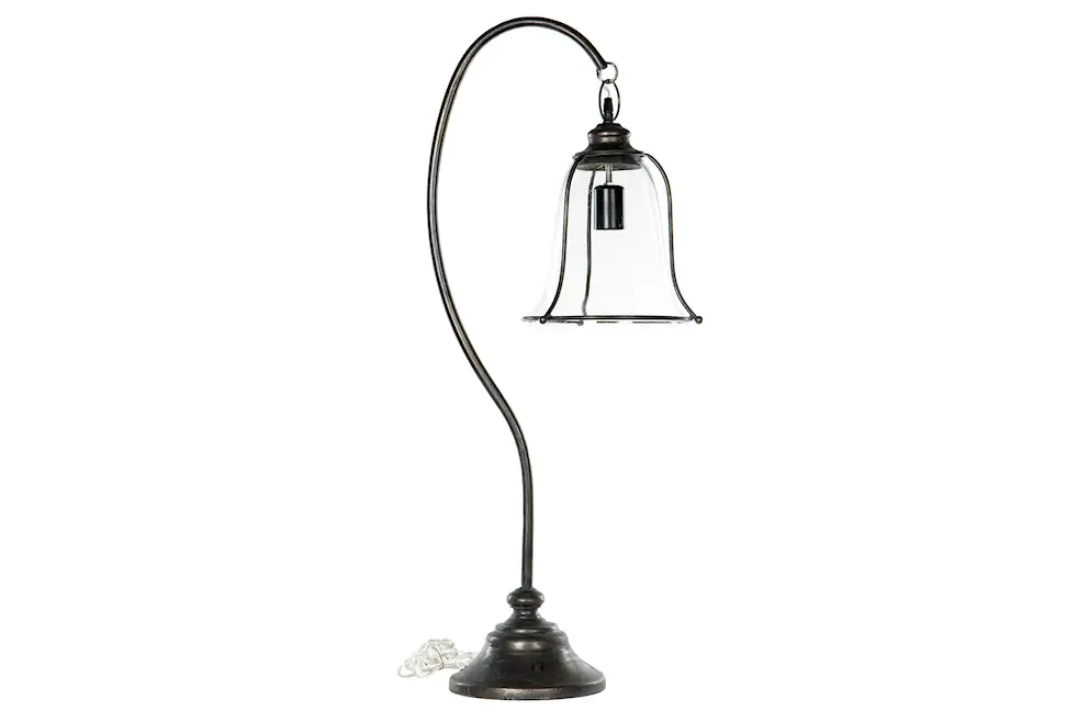 This metal table lamp has a bell-shaped glass lampshade. It adds a timeless touch to your interior.