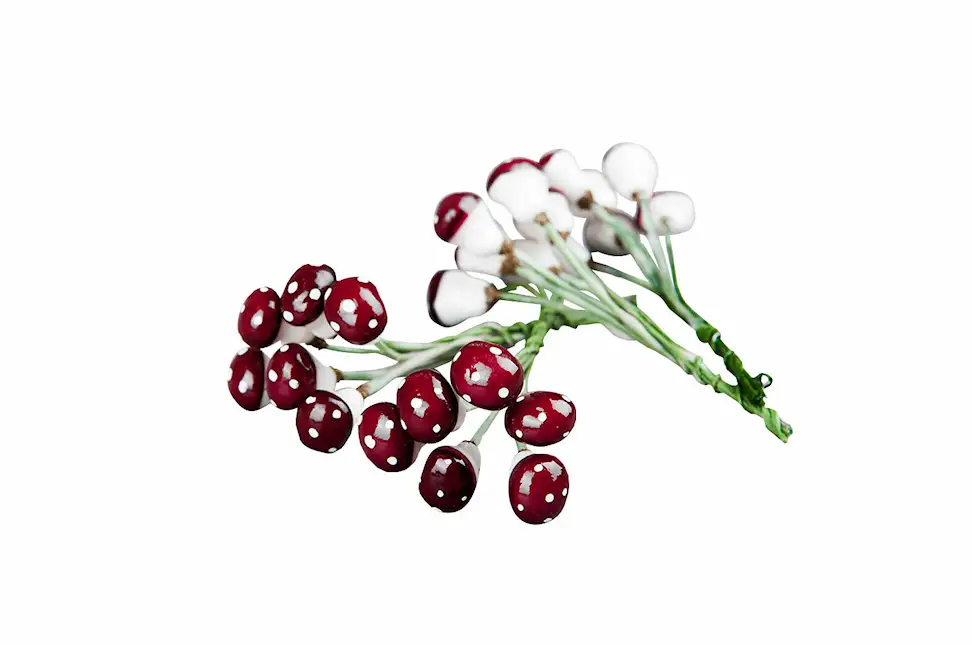 Wired toadstools that make a nice decoration in a wreath or a candle holder. Made from plastic.
