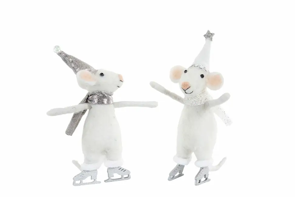 Ice skating mice in hats and scarves, made from wool. Perfect for decorating your home for Christmas.