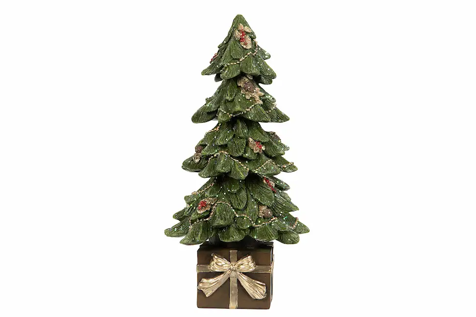 Joulukuusi ja sen alla joululahja. Täydellinen koriste talveksi. Valmistettu polyesteristä. Saatavilla eri kokoisina.