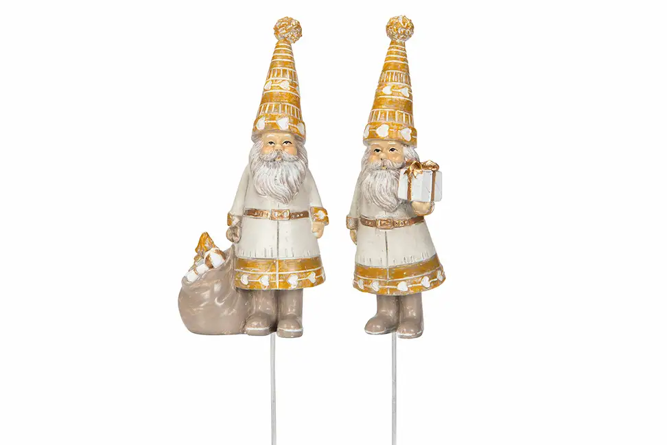 Kaksi joulupukkia kepin päällä pitelemässä joululahjaa ja säkkiä. Antaa ruukkukasville tai kranssille hieman joulutunnelmaa. Valmistettu polyesteristä.
