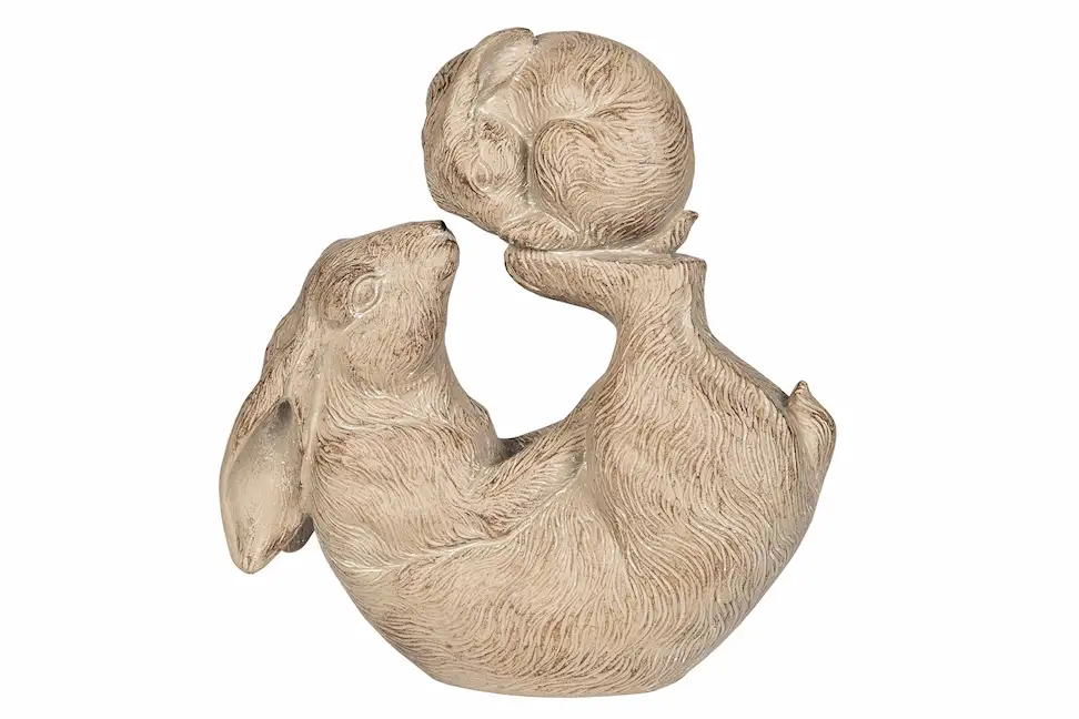 Tämä kani, joka tasapainottelee kaninpoikasta jaloillaan, tuo leikkisän silauksen kotiisi. Täydellinen pääsiäiskoristeeksi. Valmistettu polyesteristä.