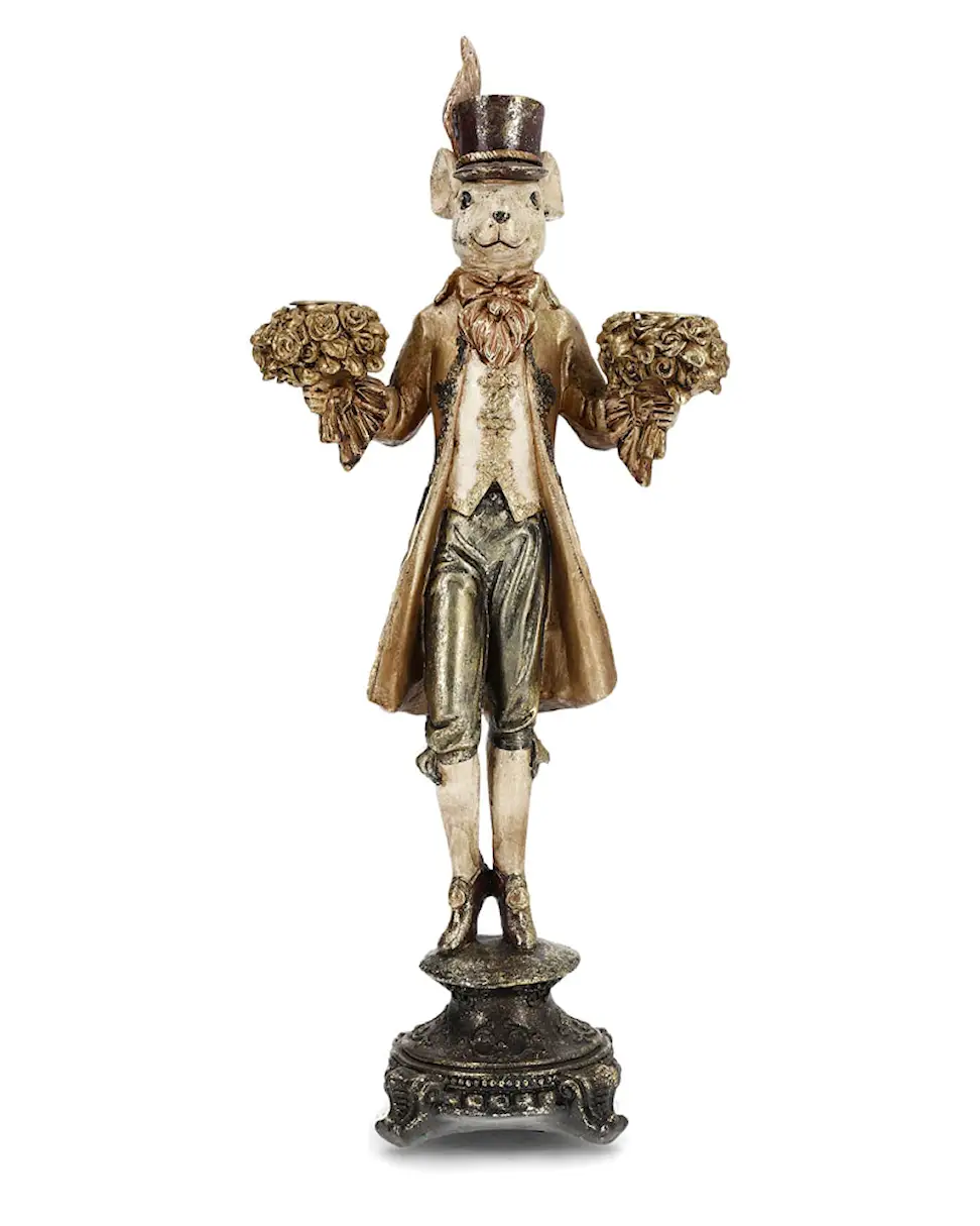 Hattuinen ja frakkipäinen hiiri pitelee kahta kimppua käsissään, missä kynttilänjalat ovat. Viehättävä ja leikkisä sisustusyksityiskohta. Valmistettu polyesteristä. Saatavilla useissa väreissä.