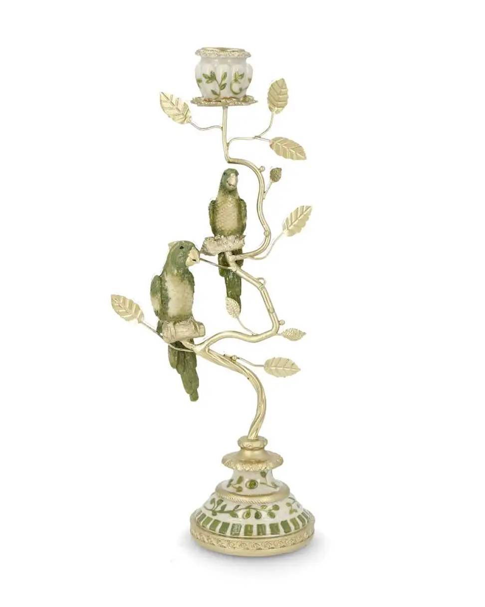 Kynttilänjalka, jossa on lintu ja oksia sekä lehtiä. Elegantti tapa tuoda kynttilänvaloa huoneeseen. Valmistettu polyesteristä.