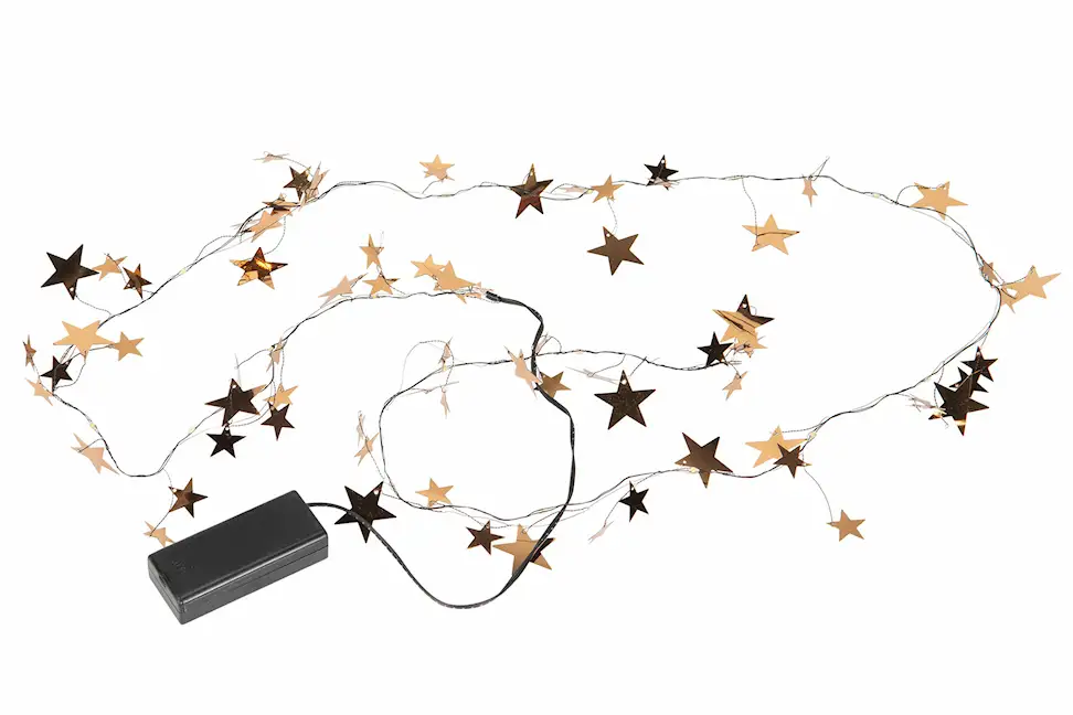 Tähdillä koristeltu LED-valosarja. Täydellinen niille, jotka haluavat kodikkaampaa valaistusta kotiinsa. Valmistettu muovista ja metallista.