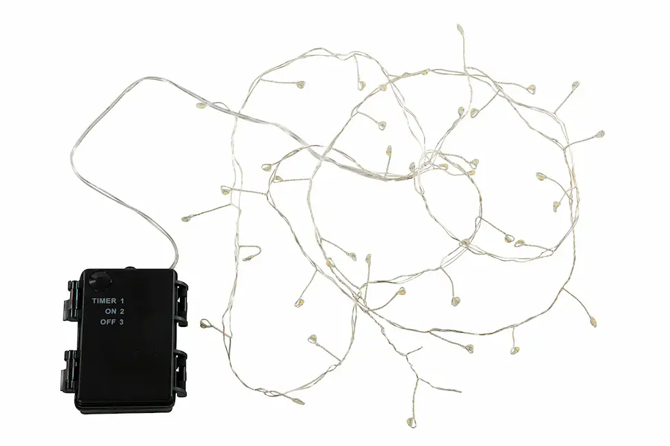 3 x AA-paristoa, 40 Varm-LED-valoa, ajastin 6 tuntia päällä ja 18 tuntia pois päältä, IP44