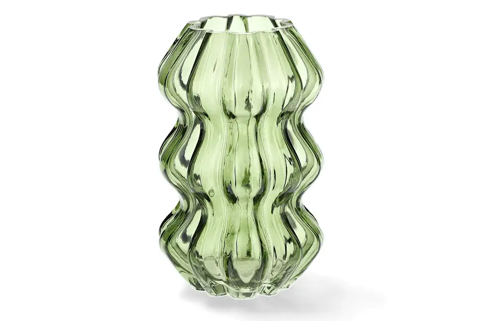 Aaltoileva ja kaareva maljakko. Niille, jotka haluavat sijoittaa kimppunsa johonkin, jossa on vähän jotain ekstraa. Lasista tehty. Saatavilla useissa väreissä.