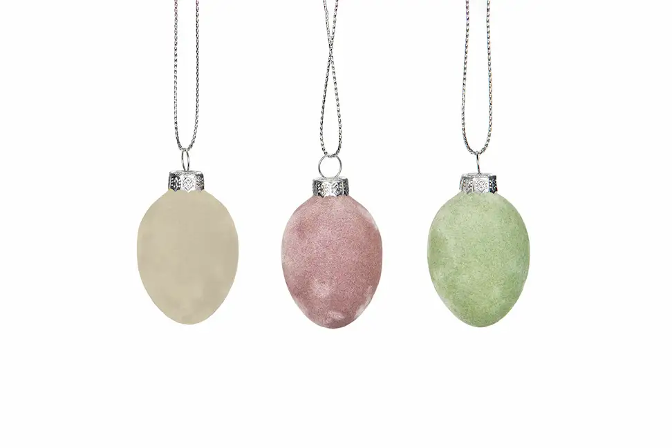 Koristele oksa-asetelma tai pääsiäiskimppu näillä värikkäillä, samettisen pinnalla olevilla riippuvilla munilla. Valmistettu lasista. Saatavilla eri kokoisina.
