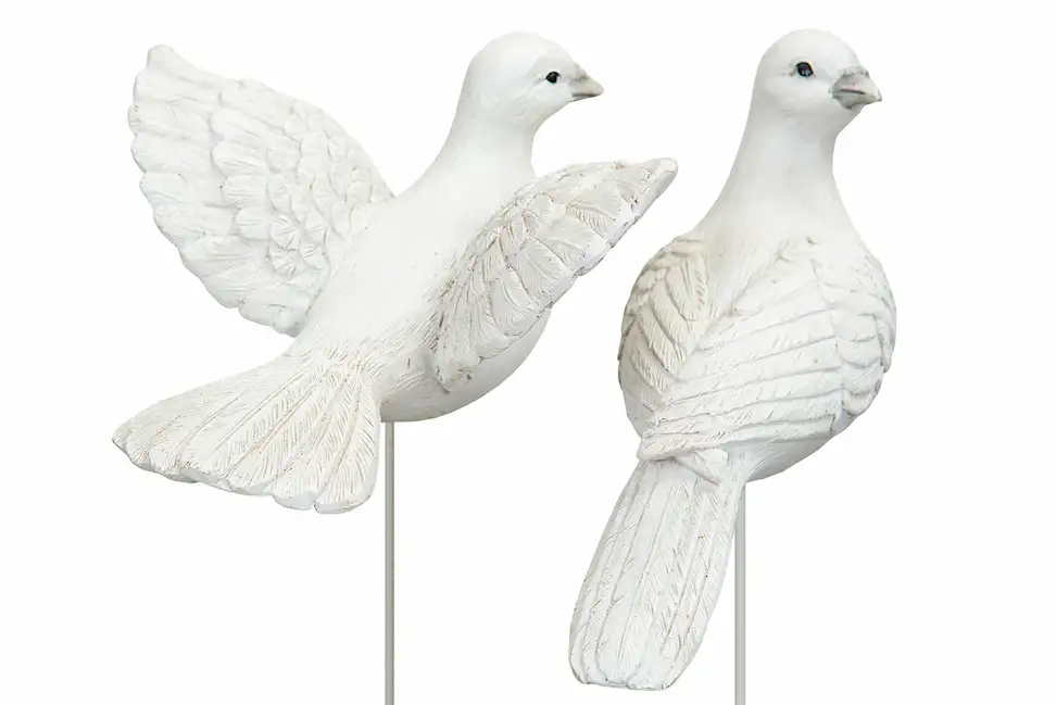 Kyyhkysiä kepin päässä, jotka on mukava laittaa ruukkukasviin tai mihin tahansa muuhun asetelmaan. Valmistettu polypropeenista. Saatavilla useissa kokoluokissa.