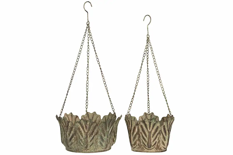 Set med tvÄ amplar med fina bladdetaljer. Ett charmigt sÀtt att hÀnga upp vÀxter. Tillverkade i metall. Det finns ocksÄ olika matchande krukor, marschallhÄllare, planteringsbord m.m.