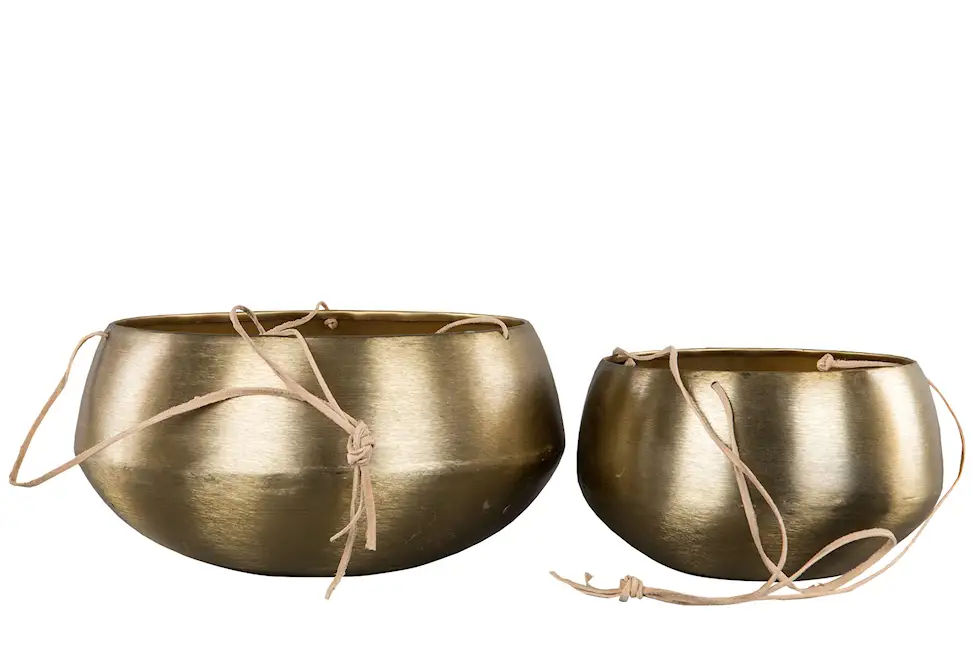 Två rundade ampelkrukor med läderband som hänger vackert i fönstret eller i taket. Tillverkade i metall. Finns i flera färger.