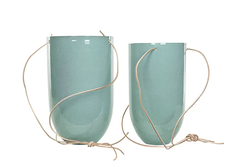 Lou är ett set med två avlånga ampelkrukor med läderband som hänger vackert i fönstret eller i taket. Tillverkade i metall.