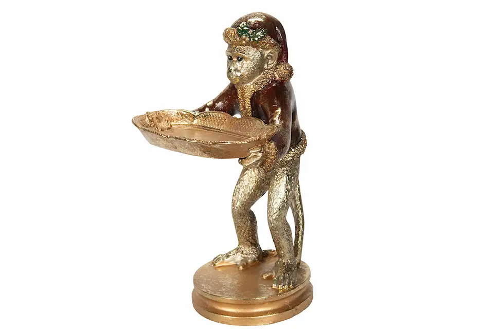 En apa med jultema som håller en bricka. Perfekt för att inreda hemmet i en lekfull och exotisk stil. Tillverkad av poly.