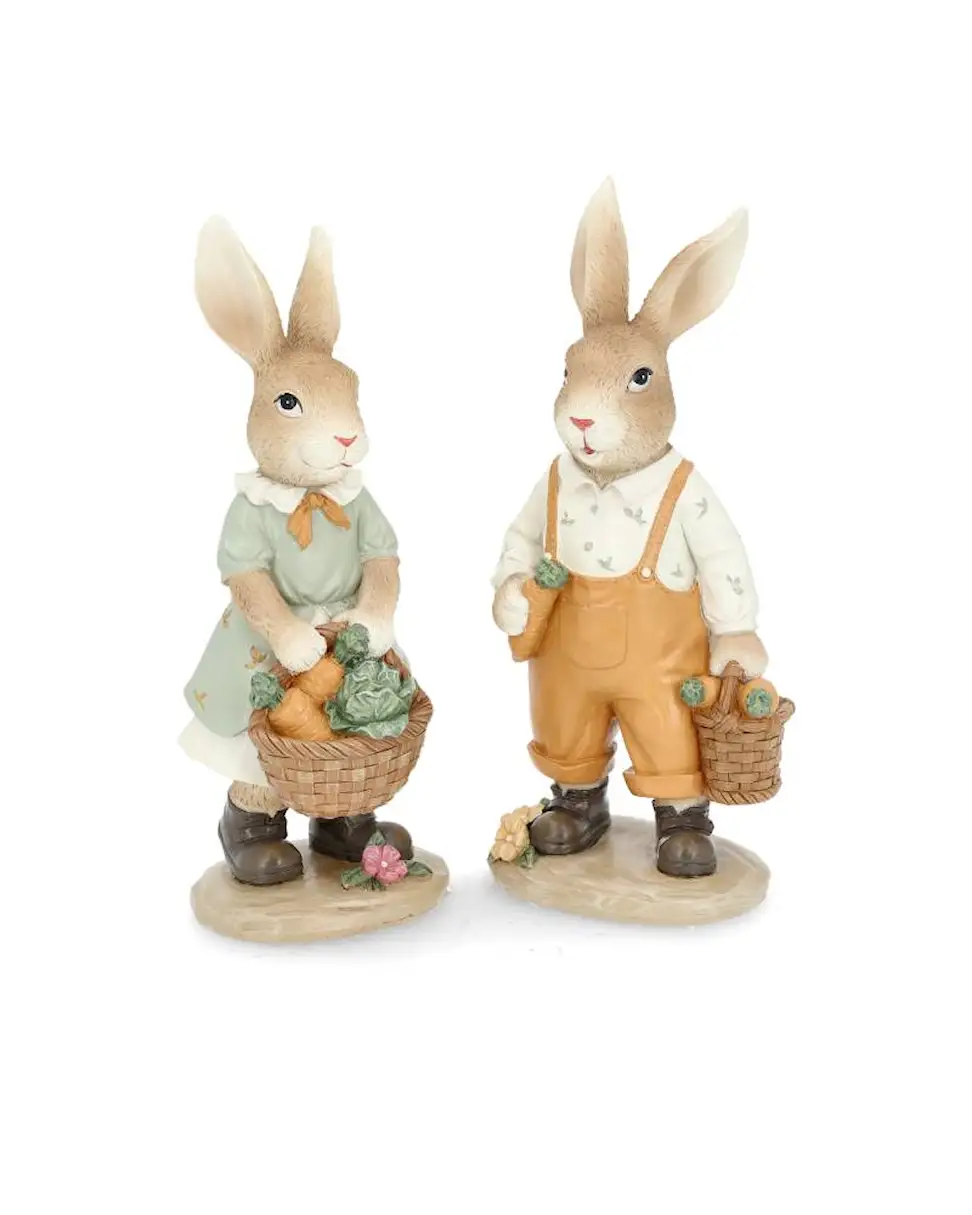Två kaniner som håller en korg med grönsaker. Perfekt som dekoration i fönstret eller på soffbordet. Tillverkade i poly.