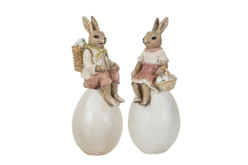 Få fram påskkänslan med en söt dekoration med harar som sitter ett ägg. Tillverkade i poly.