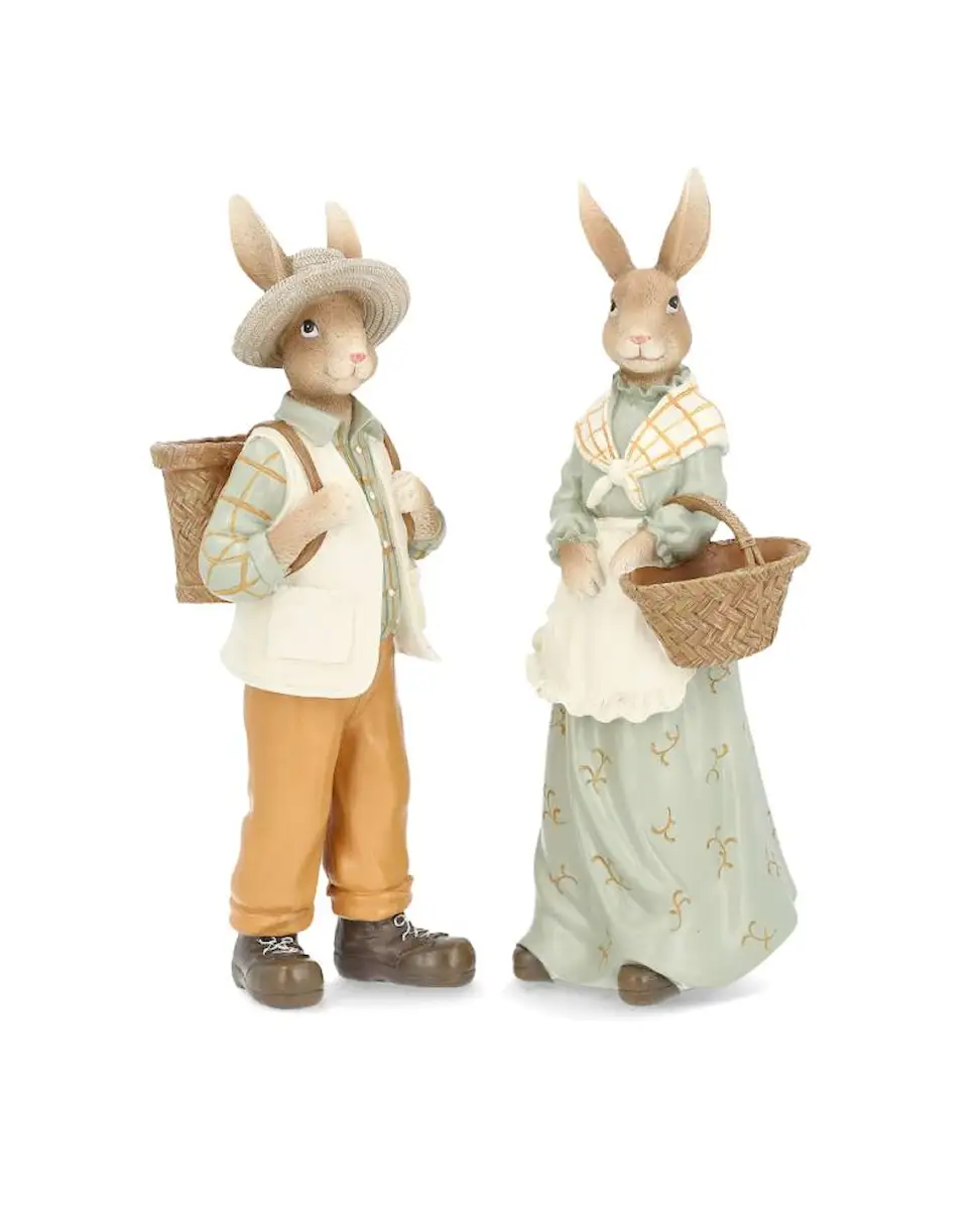Sött kaninpar som är klädda för en utflykt. Perfekt som dekoration i fönstret eller på soffbordet. Tillverkade i poly.
