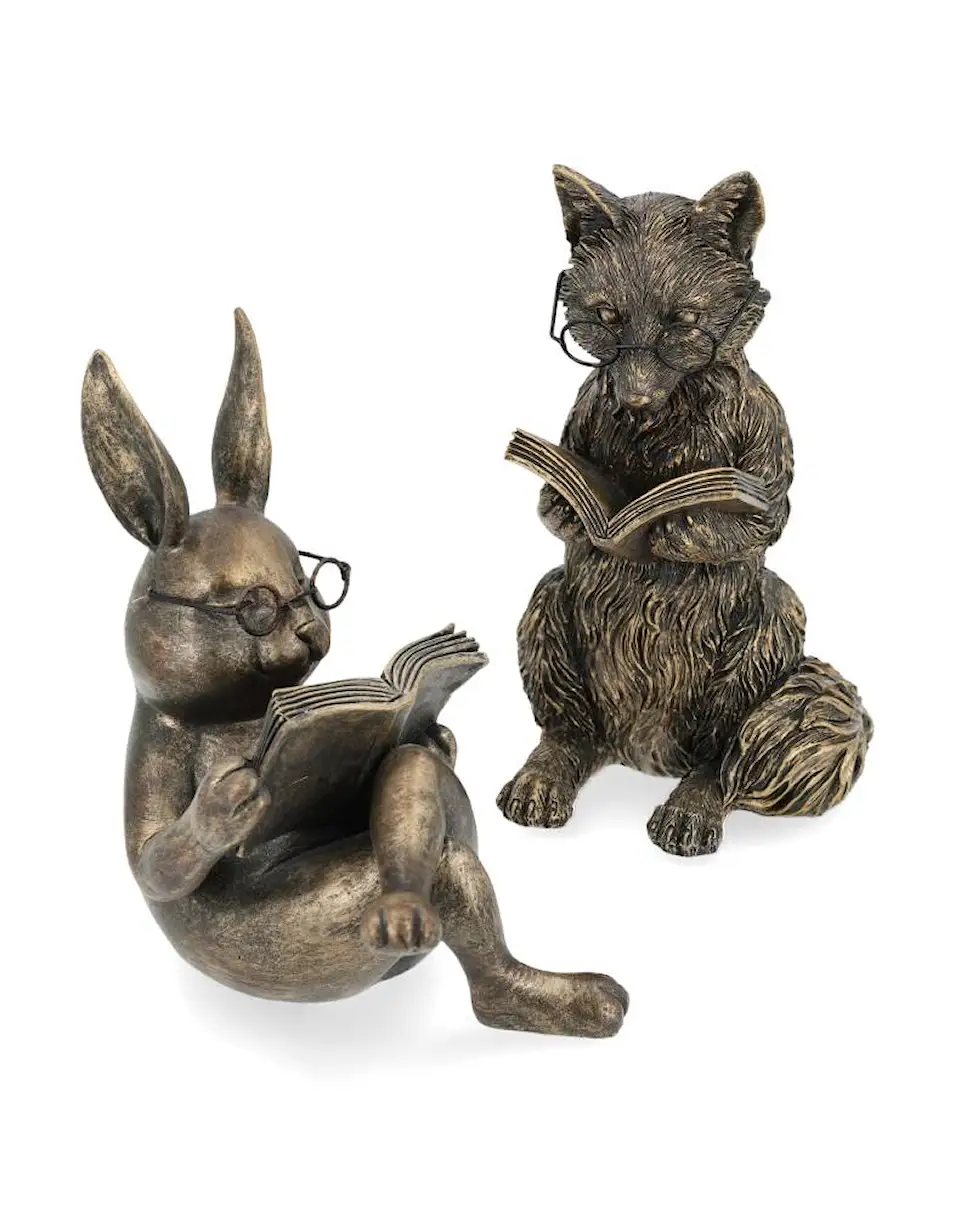 Inred hemmet på ett lekfullt sätt med en läsande räv och kanin. Tillverkade i poly.