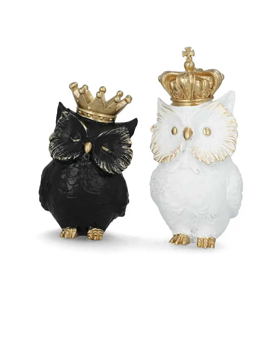 Två ugglor som har en krona på huvudet. En rolig dekoration som ger hemmet en lekfull touch. Tillverkade i poly.
