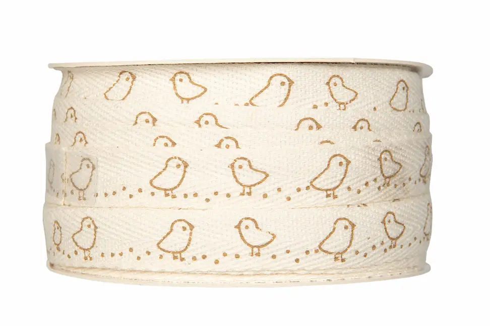 Dekorationsband mönstrat med små kycklingar. Perfekt för påskdekorationer. Tillverkat i bomull. Finns i flera färger.