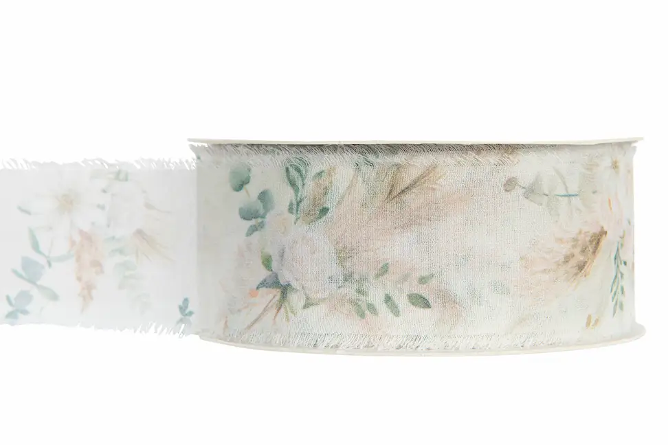 Blommönstrat dekorationsband med franskant som ger inslagningen en vacker stil. Tillverkat i polyester.