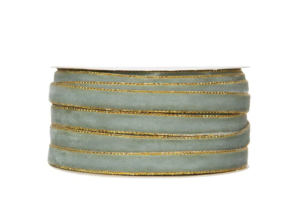 Sammetsliknande dekorationsband med guldkant som ger presenterna eller dekorationerna en elegant touch. Tillverkat i polyester och rayon. Finns i flera färger och storlekar.