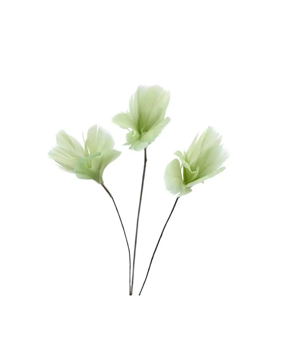 Fjädrar med ståltråd, formade som blommor. Perfekta för att dekorera grenar eller blomsterarrangemang. Finns i flera färger.