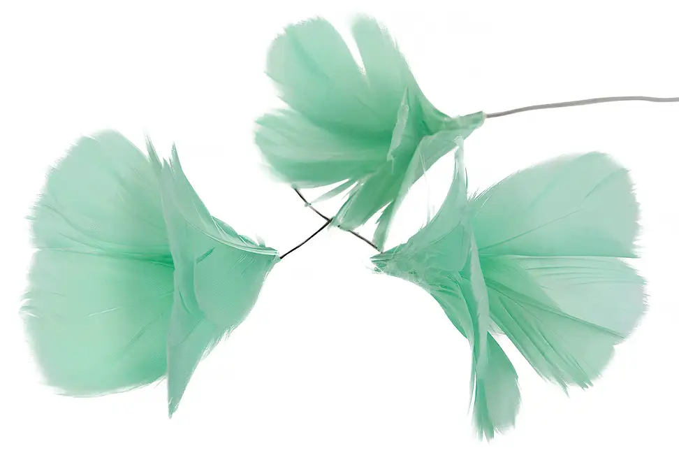 Fjädrar med ståltråd, formade som blommor. Perfekta för att dekorera grenar eller blomsterarrangemang. Finns i flera färger.