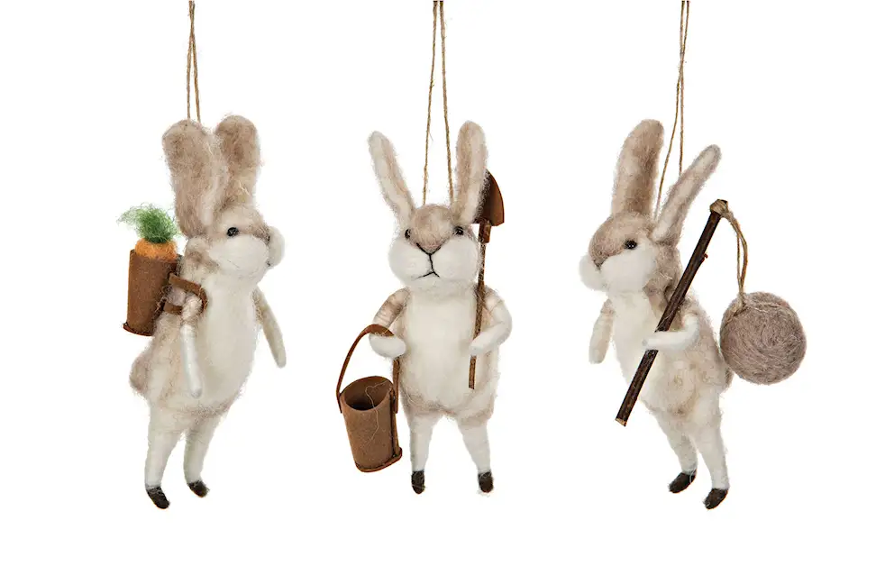 Kaniner med trädgårdsredskap, gjorda av ull. Perfekt när du vill ha en rolig dekoration eller ett lekfullt blomsterarrangemang.