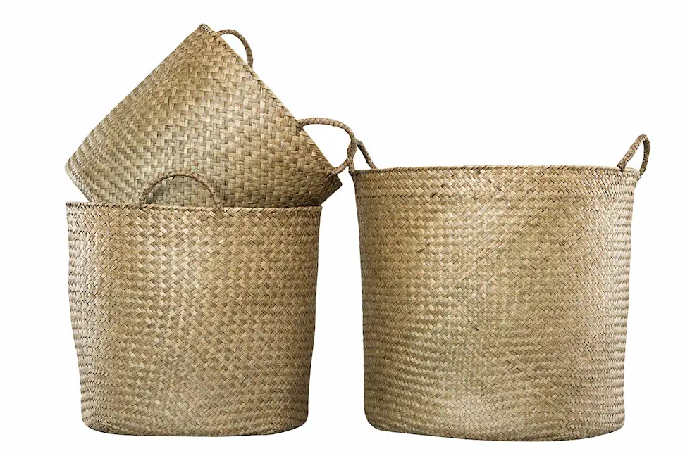 Detta set med tre flätade korgar med insida i plast är det perfekta sättet att presentera din blomkruka. Tillverkad av gräs.