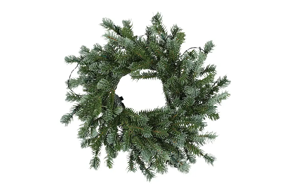 Krans med grankvistar och LEED-ljus som är fin att hänga upp som den är eller som ett jularrangemang. Tillverkad i plast.