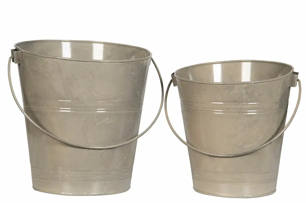 Plantera dina favoritblommor i detta set med två krukor som ser ut som hinkar med handtag. Tillverkade i metall. Finns i flera färger.