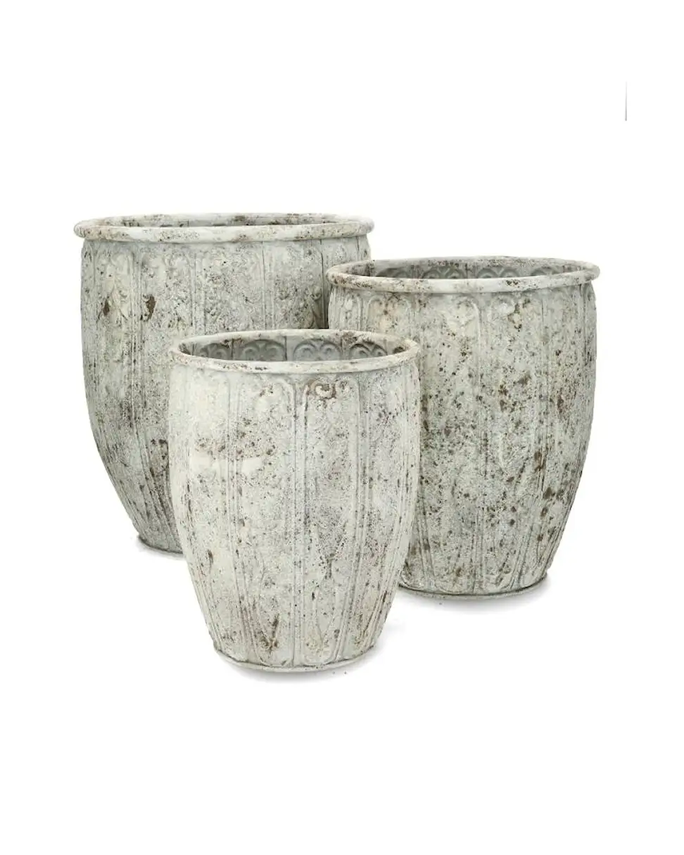 Set av tre mönstrade krukor i olika storlekar med en unik, väderbiten, finish. Det lätta och tåliga materialet gör krukorna enkla att flytta omkring. Passar inom- och utomhusbruk.