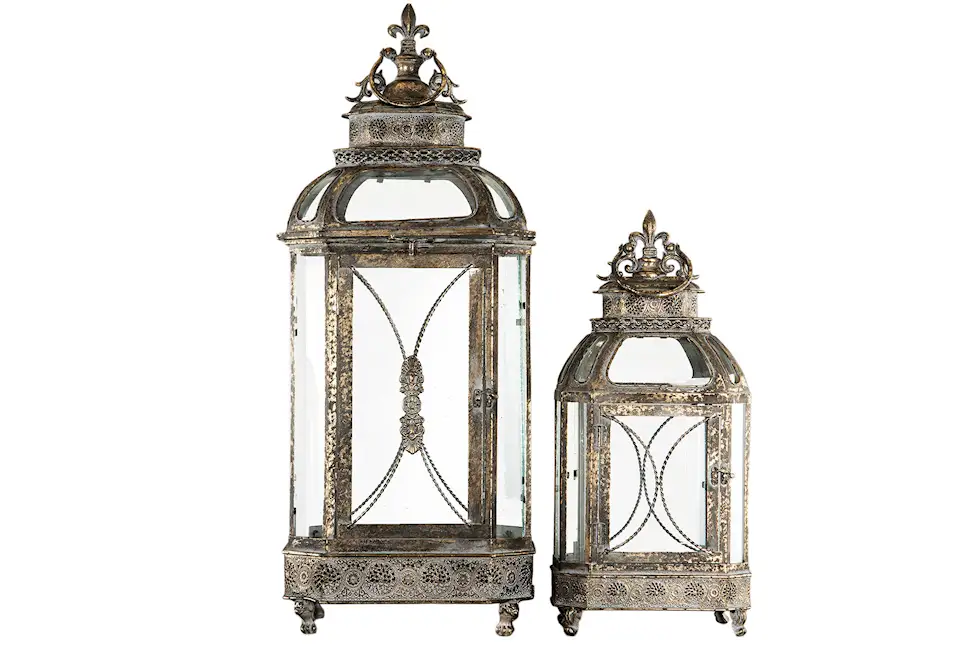 Detta set med två lyktor ger ett mysigt sken av levande ljus. Den stora storleken gör att de är perfekta för att lysa upp uteplatsen eller ge ett välkomnande sken vid ytterdörren. Tillverkade av metall och glas.
