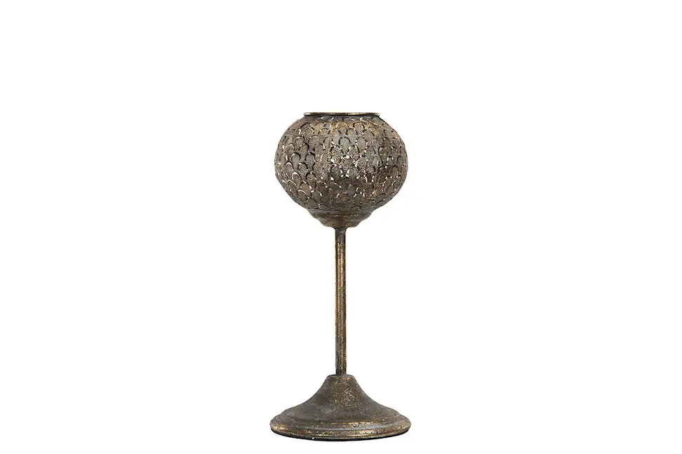 Vår lykta Saga är en vacker ljuslykta med dekorativa detaljer, tillverkad i metall. Den höga foten gör att ljuset verkligen hamnar i blickfånget.