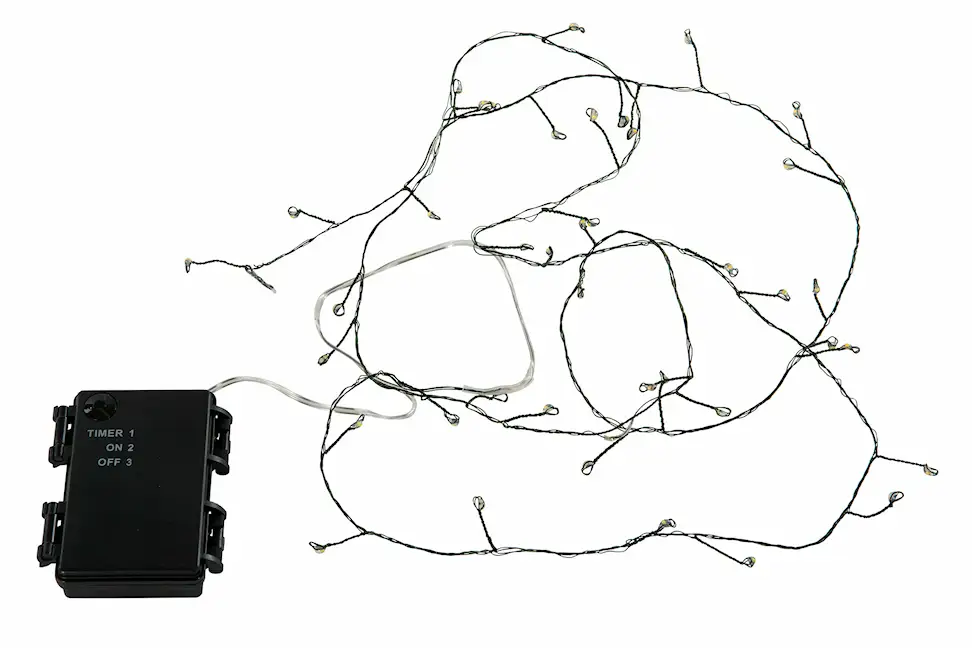 40 varma LED-lampor. Timer: 6 timmar på och 18 timmar av. Drivs av 3 st. AA-batterier (ingår ej)