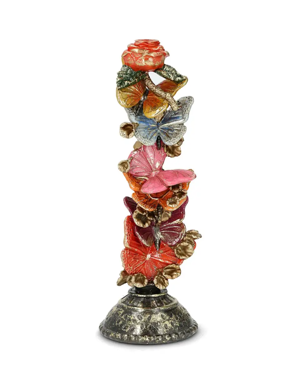 Inred med levande ljus med en fin ljusstake dekorerad med fjärilar. Tillverkad i poly.