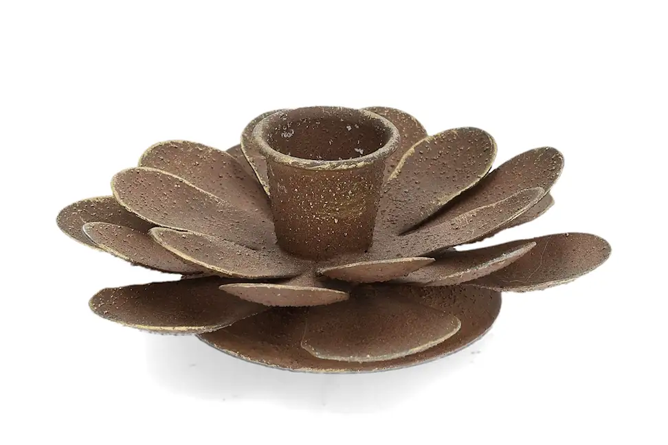 Blomformad ljusstake som blir ett fint sätt att få in levande ljus i hemmet. Tillverkad i metall.