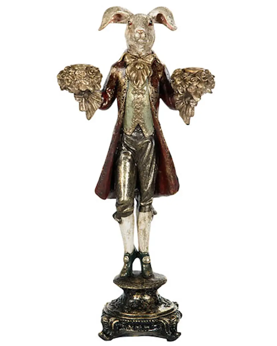 Kanin som håller två buketter i händerna där ljushållarna finns. Perfekt som påskdekoration. Tillverkad i poly. Finns i flera färger.