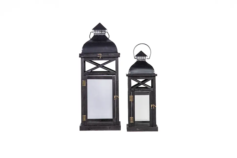 Set med två lyktor som är perfekta att ha i ett fönster, vid entrén eller i uterummet. Tillverkade i trä och glas.