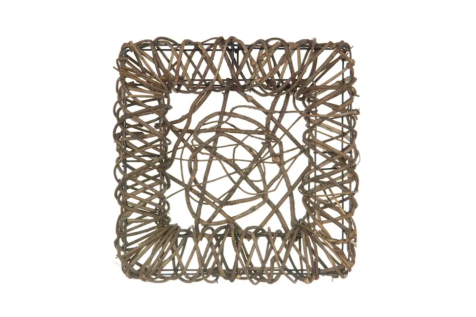 Kvadratisk krans i naturmaterial. Kransen har en botten och är en bra bas för blomsterarrangemang. Kan kombineras med kottar, mossa, blommor, sticks m.m