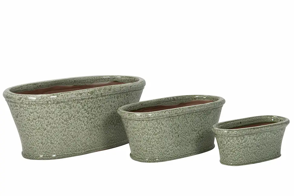 Odla kryddor och örter eller vackra blommor i detta set med tre ovala krukor/planteringslådor. Krukorna är frosttåliga och har ett hål i botten för smidig dränering. Tillverkade i lergods.