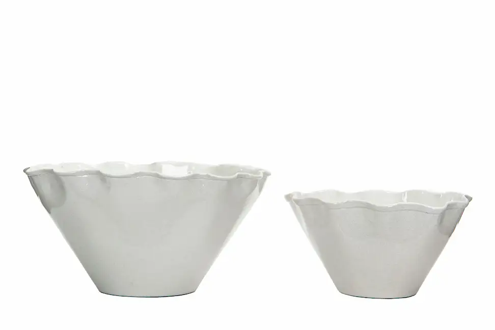 Set med två emaljerade skålar med vågig kant. Fina att använda till dekorationer och växter. Tillverkade i metall. Finns i flera färger.