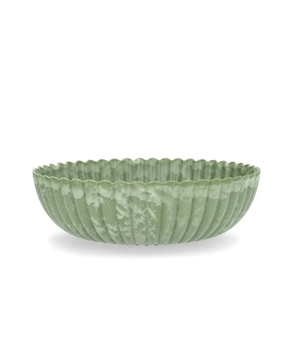 Skål med vågig kant, tillverkad i återvunnen plast. För dig som vill inreda med dekorationer, växter och ljus.