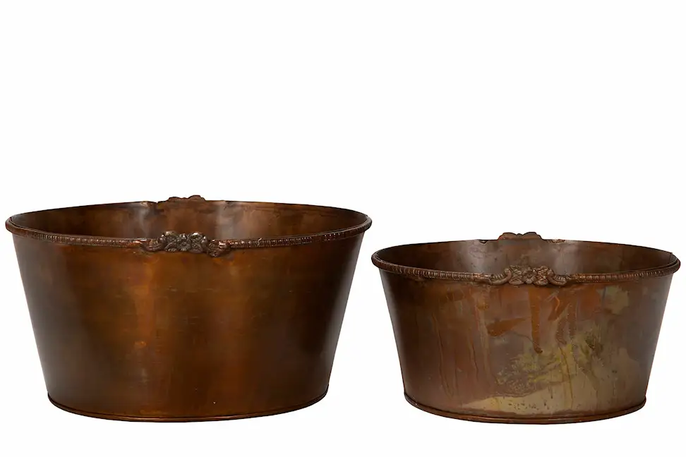 2-pack rustika skålar med fina blomdetaljer. Den lite högre designen gör att de också kan användas som krukor. Tillverkade i metall. Ger en trevlig och ombonad känsla i hemmet. Finns i flera färger.