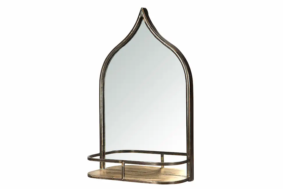 En fin spegel med kupolformad topp och liten hylla som passar bra till småförvaring eller för att ställa dit en liten vas med blommor. Tillverkad i metall och spegelglas.